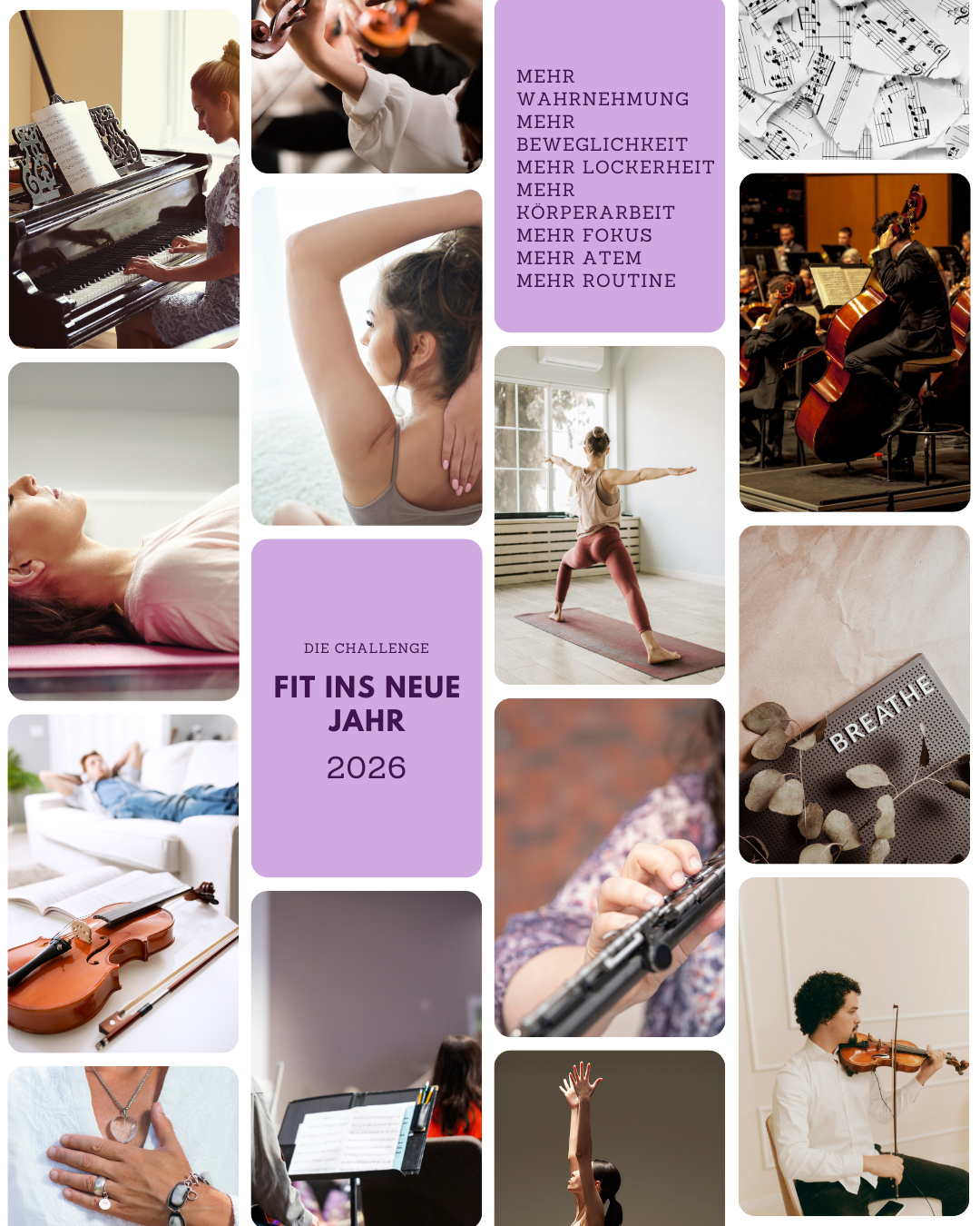 Collage zur ‚Fit ins Neue Jahr 2026‘-Challenge für Musiker:innen mit ruhigen Motiven aus Musizieren, Bewegung, Atem und Entspannung sowie Text: mehr Wahrnehmung, Beweglichkeit, Lockerheit, Körperarbeit, Fokus, Atem und Routine.